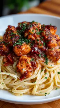 - Agrega la pasta cocida a la salsa y mezcla suavemente; coloca el pollo crujiente encima y sirve.